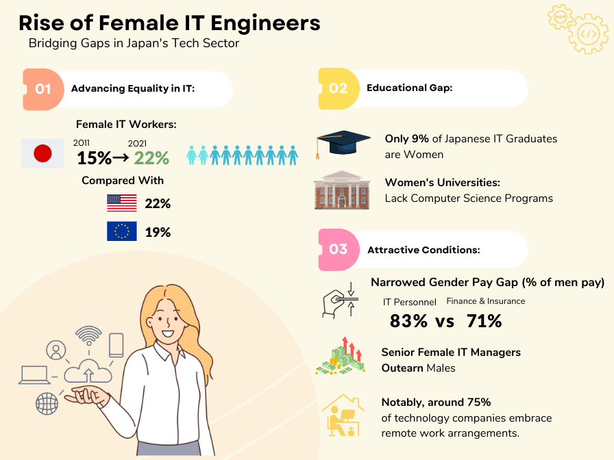 Better pay and conditions are helping attract more women into the sector. A smaller gender pay gap sees female IT personnel paid 83% of male counterparts, compared to 71% in finance and insurance, according to a study by the Ministry of Health, Labour and Welfare. Senior female managers in IT actually outearn male ones. In addition, around three-quarters of technology firms currently allow remote work, a higher proportion than any other industry and a potential deal breaker for women continuing their careers in parallel with child rearing.